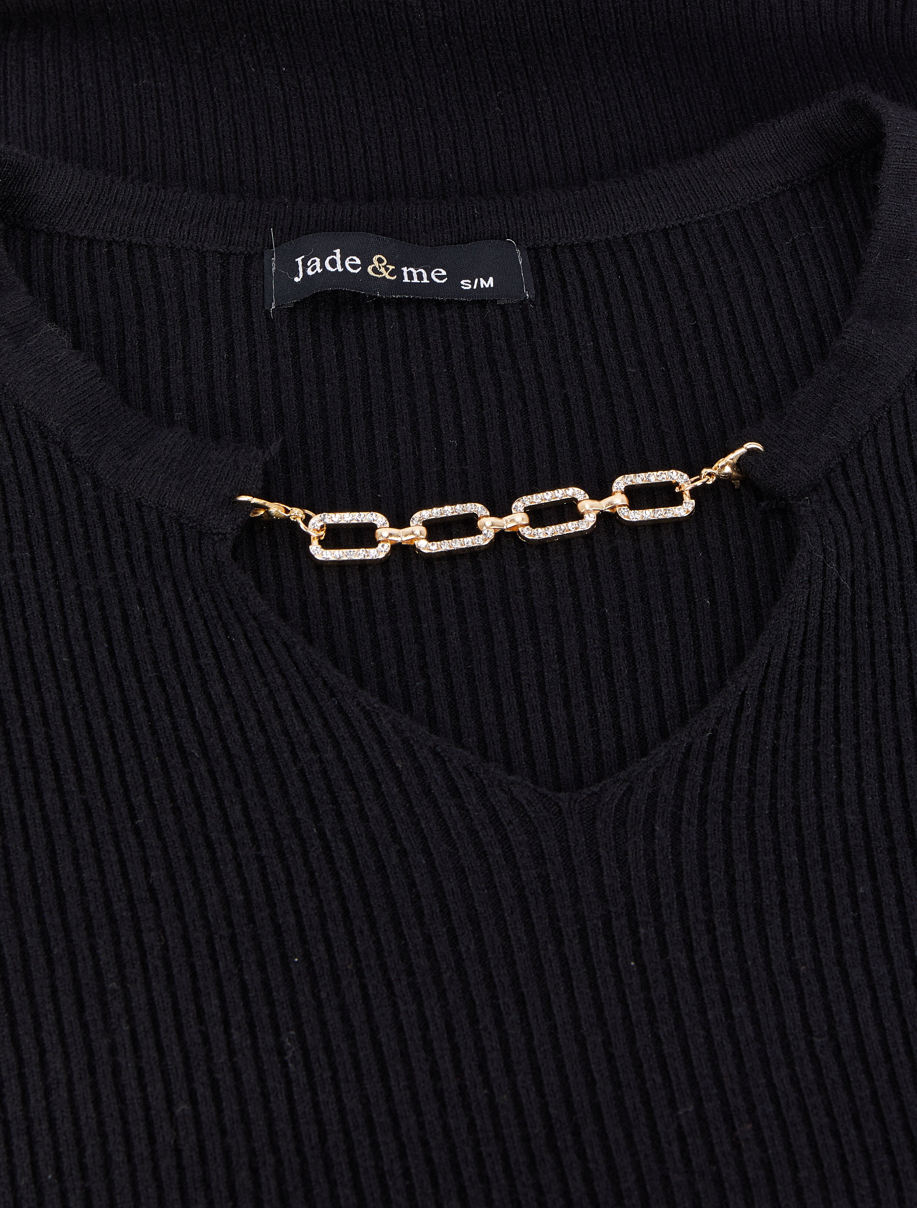 Geribbelde trui met V-hals versierd met een afneembare ketting met strass-stijl juweel - zwart