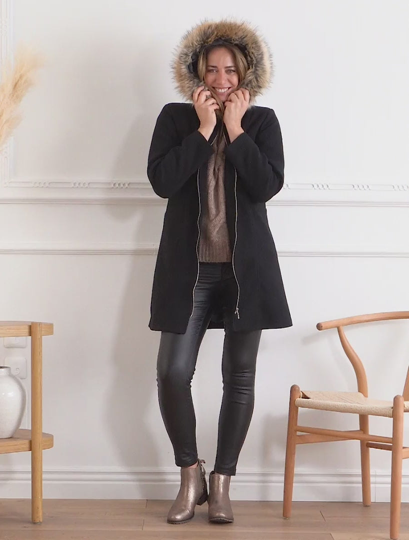 Ce look se compose d'un manteau long noir en feutrine avec capuche ornée de fourrure synthétique amovible et fermeture zippée, d'un pull taupe à maille torsadée épaisse avec col V flatteur et coupe droite, d'un jean skinny noir enduit à effet push-up gainant et sculptant, de bottines taupe en simili cuir irisé à talon bloc avec ruban pailleté, et d'un sac à main marine en simili grainé avec anses et bandoulière amovible.